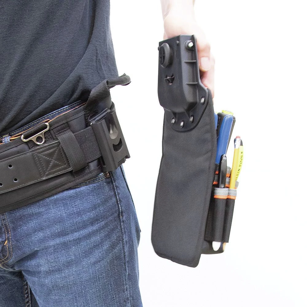 - Tool belt system with quick-release clip design allows for easy change of tool pouches