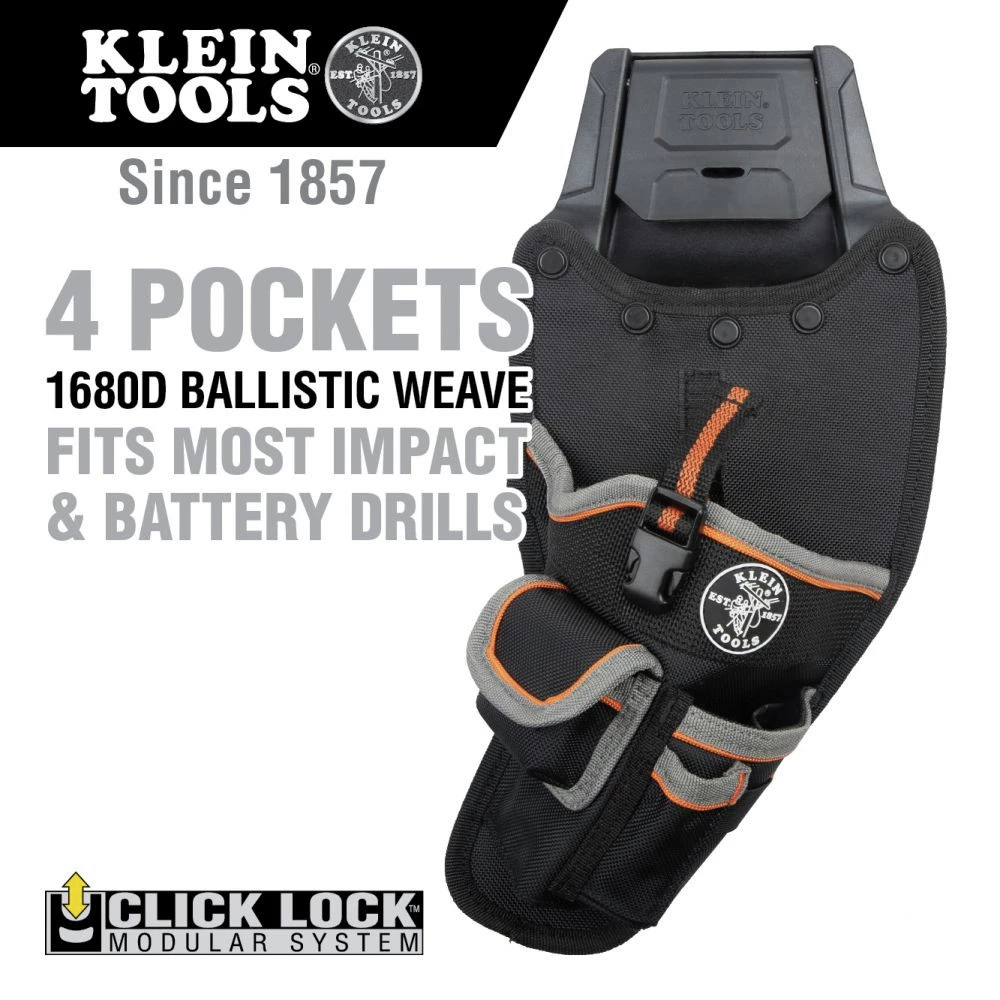 - Fits most impact and battery drills and has pockets for tools and drill bits